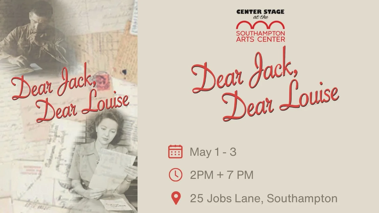Ken Ludwig’s Dear Jack, Dear Louise makes its Long Island debut at the Southampton Arts Center from May 1- 3, 2026. Starring Barbara Jo Howard and Jack Seabury, this intimate two-person play tells the true story of Ludwig’s parents, who fell in love through letters during World War II. What begins as a simple correspondence grows into a deeply moving romance shaped by distance, uncertainty, and hope.